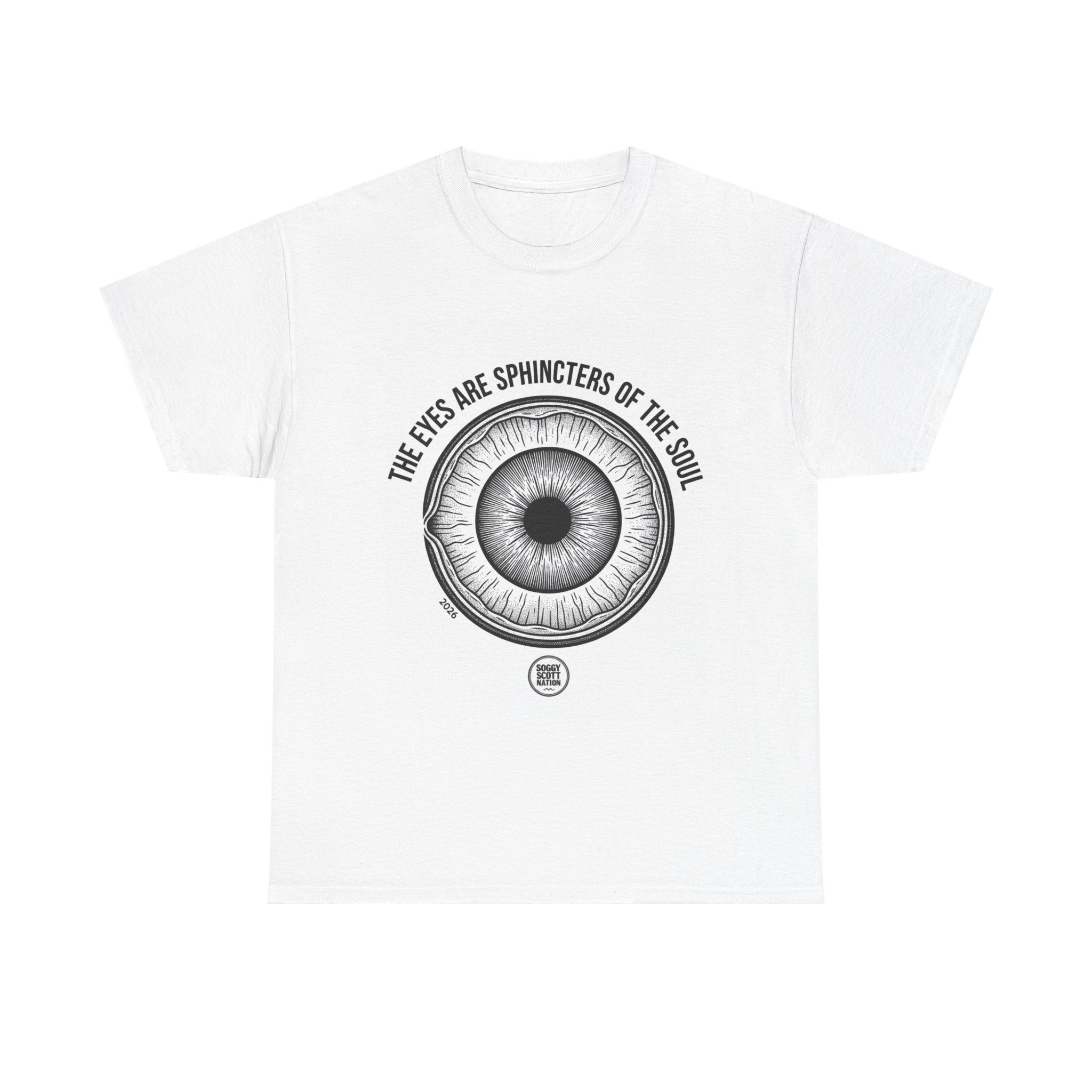 A bold, contemplative tee that wears like a quiet statement. The central, hand-etching style eye draws you in — detailed iris lines and a shaded pupil sit beneath the curved phrase “THE EYES ARE SPHINCTERS OF THE SOUL.” It feels like a sketch pulled from an old sketchbook: curious, a bit uncanny, and entirely human. The medium-weight cotton gives it structure without stiffness, so the print rests flat and crisp. Wear it to slow down conversations, spark strange compliments, or anchor an outfit when you want to look thoughtful without trying too hard. It pairs easily with layered streetwear or simple jeans, and the tubular knit construction and ribbed collar keep the silhouette clean through many washes.